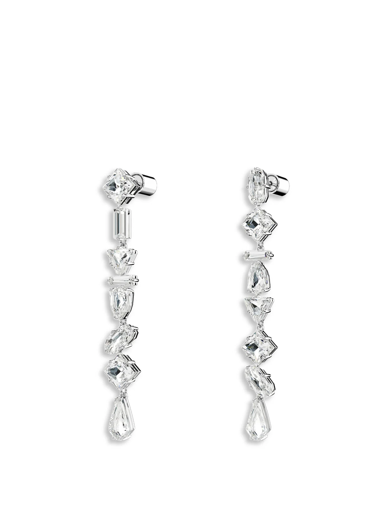 These radiant Mesmera earrings were crafted for extravagant style. Within each piece, the dazzling design features a cascade of prong-set crystals in a rhodium plated setting, with each stone crafted in a different shape.