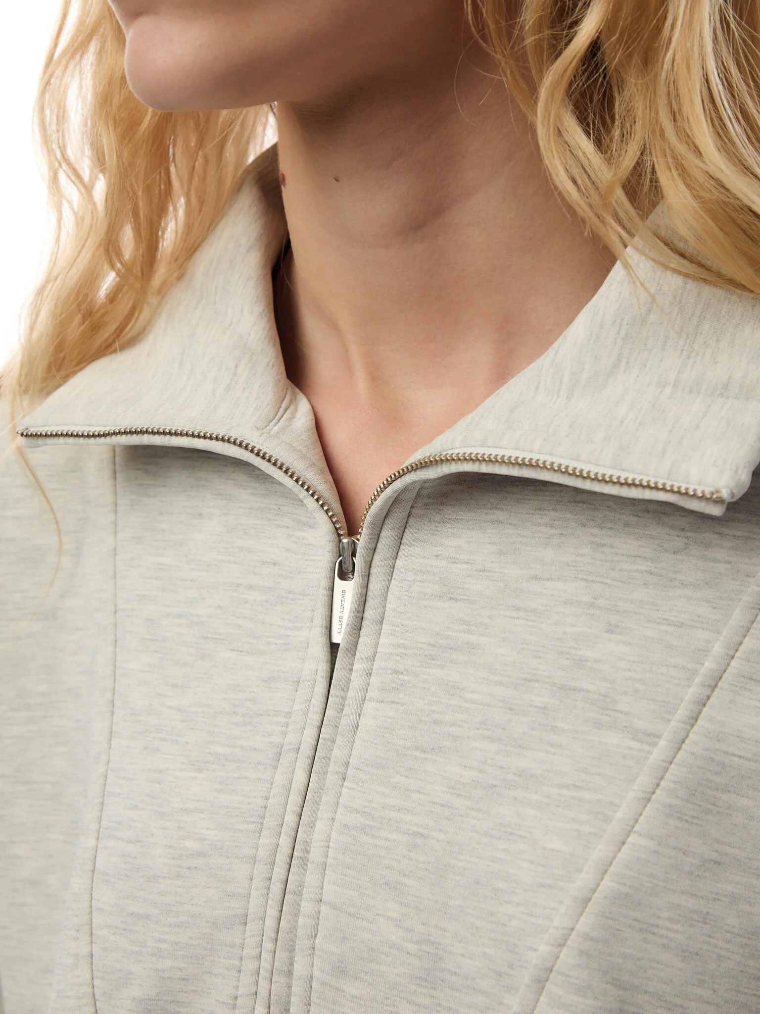 Our feminine, studio-to-street cropped sweatshirt. Peachy soft 58% recycled fabric has a scuba-like feel. Relaxed fit with dropped shoulders and full-fashioned sleeves. High collar with a half zip and a flattering V seam detail on the chest.